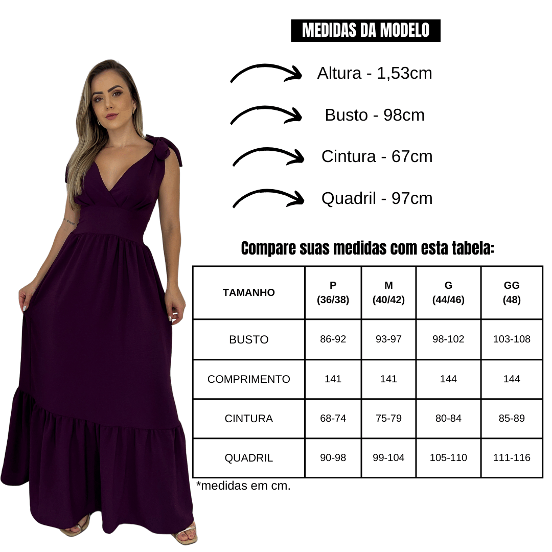O Vestido Longo Roberta apresenta uma elegância encantadora com um toque de estilo e luxo. Seu tecido suave e fluído oferece conforto e movimento gracioso, enquanto o corte sutilmente ajustado na cintura cria uma silhueta feminina e elegante.